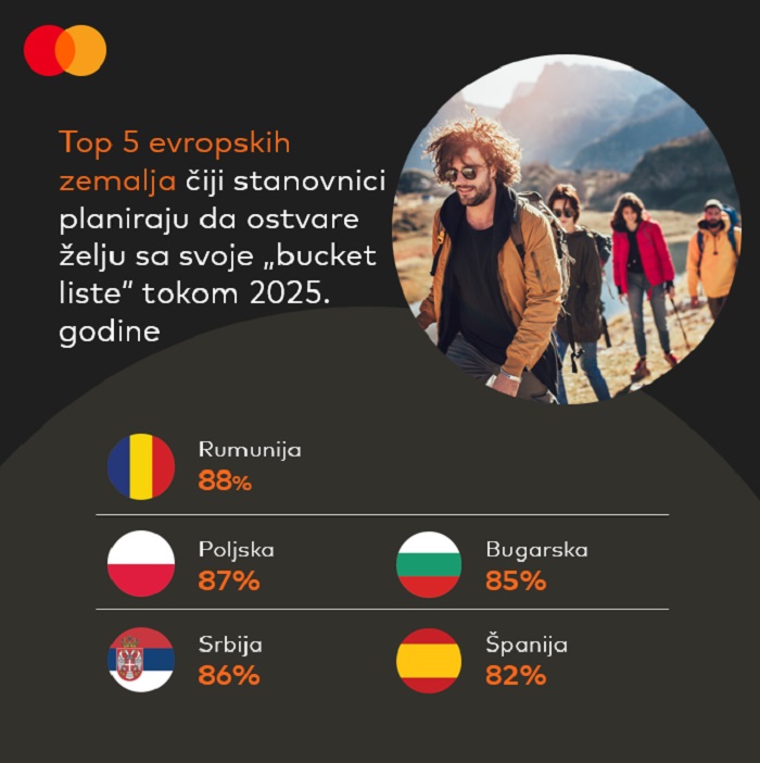 Dok se Evropa sprema za još jednu godinu spektakularnih događaja u svetu sporta, muzike i filma, rezultati najnovije godišnje ankete kompanije Mastercard, Experience Economy, otkrivaju nove trendove u potrošačkim navikama. Dve trećine ispitanika želi da uloži u ispunjenje svojih želja sa zacrtane „bucket liste“, birajući nezaboravne trenutke koji će im obezbediti trajne uspomene, posebno u oblasti putovanja i turizma. Zanimljivo je da se Srbija nalazi na vrhu liste evropskih zemalja, zauzimajući treće mesto, odmah iza Rumunije (88%) i Poljske (87%), jer čak 86% ispitanika u Srbiji očekuje da ispuni još jednu želju sa svoje „bucket liste“ u 2025.