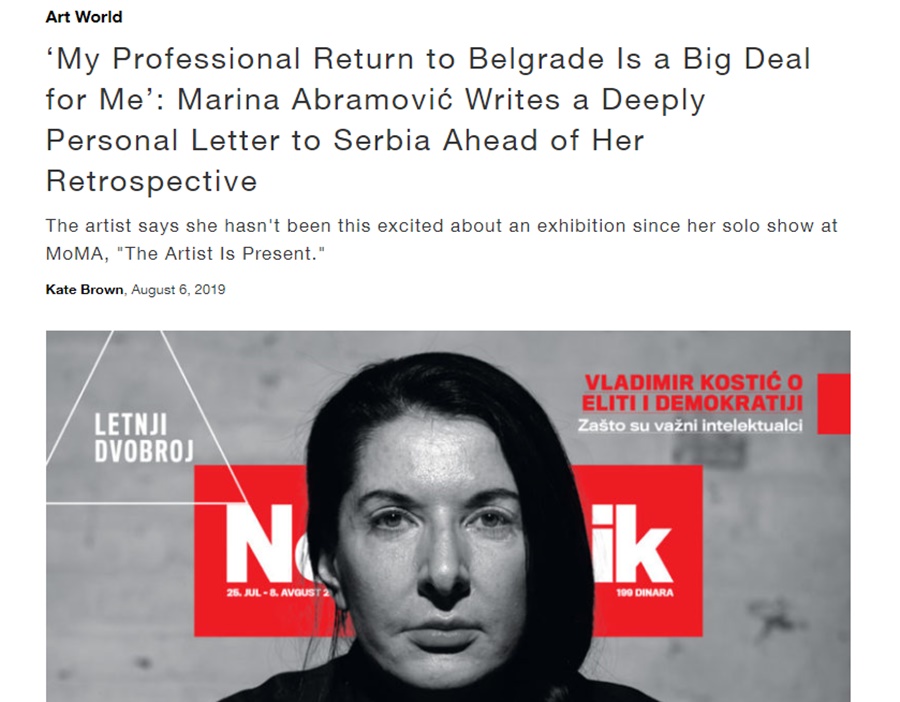 Jedan od najpoznatijih specijalizovanih sajtova za kulturu „Artnet News“ piše da je Nedeljnik ekskluzivno objavio pismo Marine Abramović Srbiji kojim je ona najavila svoj povratak u Beograd na retrospektivnoj izložbi „Čistač“ koja će biti otvorena 21. septembra i koja će trajati do 20. januara u Muzeju savremene umetnosti.