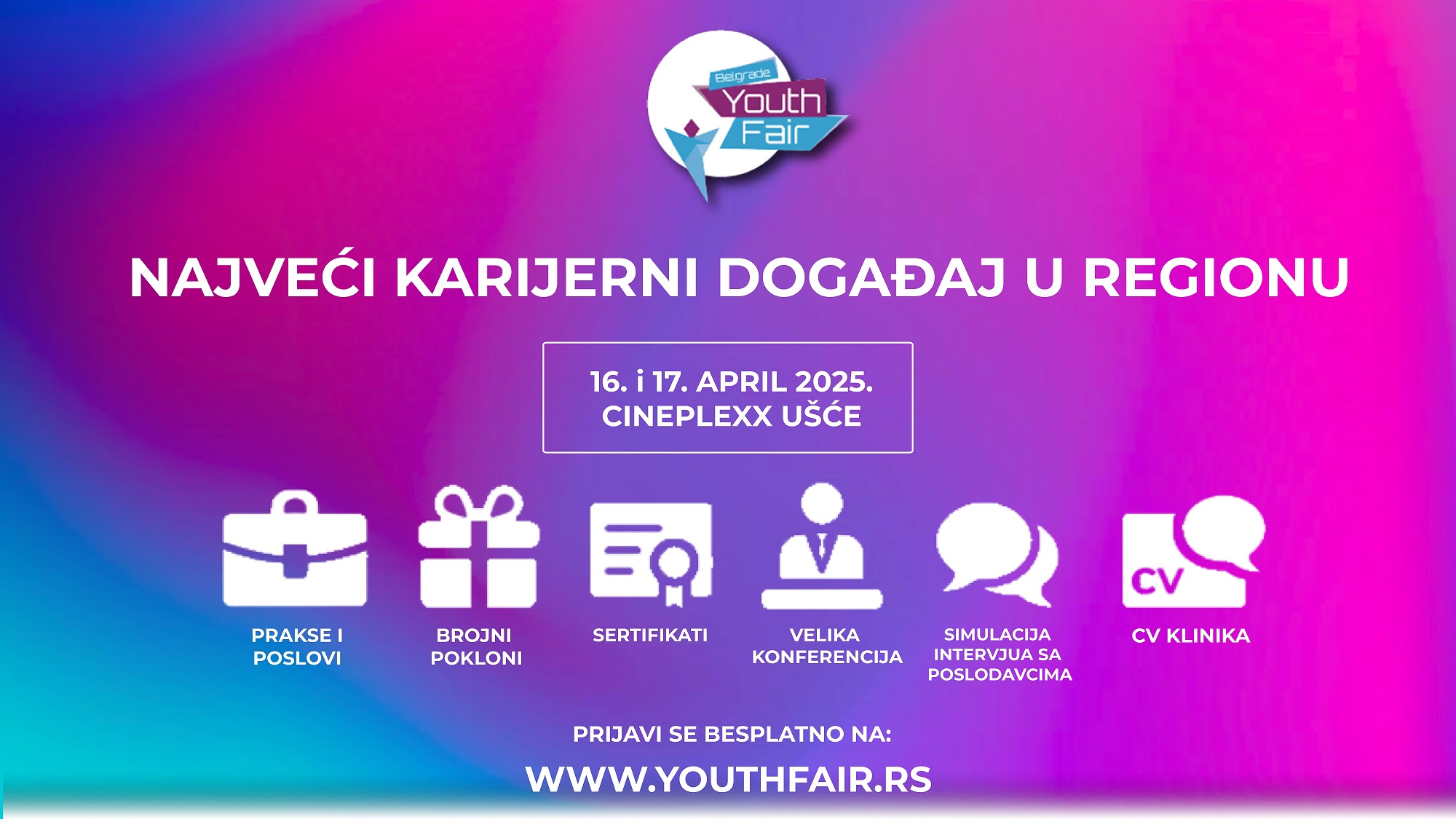 U Beogradu će se 16. i 17. aprila u Cineplexx Ušće održati 11. po redu Belgrade Youth Fair, najveći karijerni događaj za mlade u regionu.