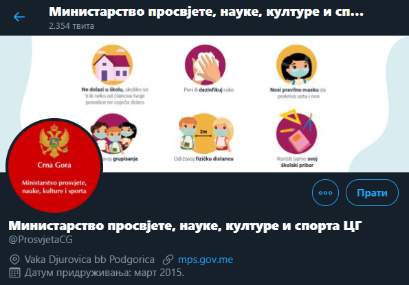 Doskorašnje „Ministarstvo prosvete Crne Gore“ danas je na društvenim mrežama Tviter i Fejsbuk promenilo ime u „Ministarstvo prosvete, nauke, kulture i sporta Crne Gore“.