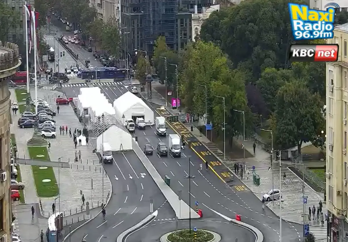 Dan pred početak redovnog jesenjeg zasedanja podignut je jedan veliki šator u kolovznoj traci ka Bulevaru, a sada se postavlja još jedan istih dimenzija.
