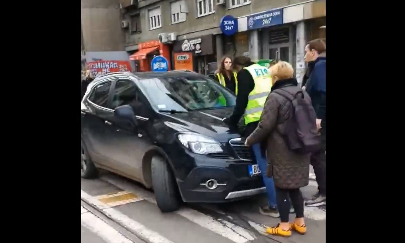 Na snimku se vidi da su studenti i građani zaustavili vozača automobila, zbog 16 minuta tišine, međutim, on je u jednom trenutku dao gas i krenuo na njih.