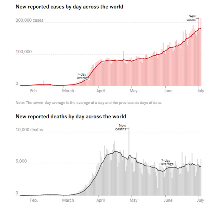 Tako je 17. juna prijavljeno više novih slučajeva u danu širom sveta nego ikada ranije: 166.099. Povećan broj novozaraženih podstaknut je žarištima u Latinskoj Americi, Africi, Aziji i na Bliskom Istoku.