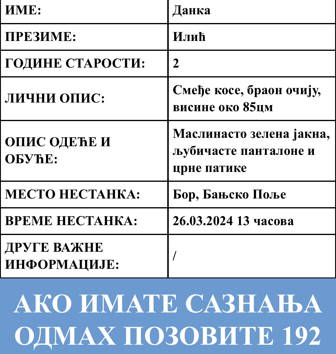 Devojčica Danka Ilić, stara nepune dve godine, nestala je na Banjskom polju u Boru, a potraga za njom traje više sati.