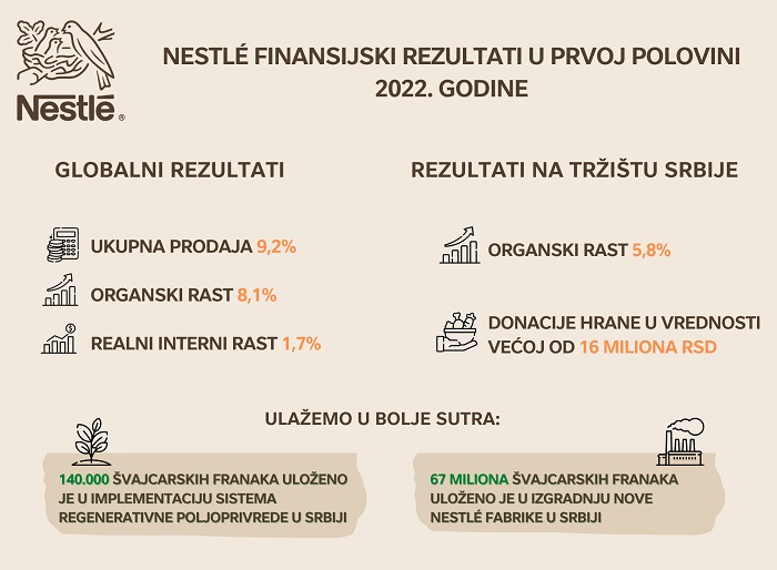 „Nestlé je u Srbiji u prvoj polovini 2022. godine ostvario organski rast od 5,8 odsto, na šta su najviše uticali naši brendovi Purina Pet Care, Nestlé Professional i Nestlé žitarice, praćeni snažnim rastom Nestlé konditorskih proizvoda. Nastavili smo i sa podrškom lokalnoj zajednici kroz donacije naših proizvoda u vrednosti većoj od 135 hiljada švajcarskih franaka. Prilagođavanje i razvijanje našeg poslovanja ostao je prioritet, te smo uložili više od 140.000 švajcarskih franaka u implementaciju principa regenerativne poljoprivrede, čijom primenom čuvamo i obnavljamo srpsko zemljište, a našim potrošačima nudimo kvalitetne proizvode čiji su sastojci uzgajani upravo u Srbiji“.