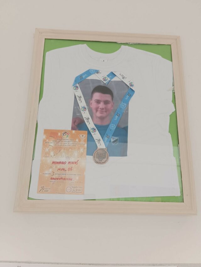 Dečak je uspeo i osvojio medalju koju je posvetio Nikoli. Ta je majica uramljena i zajedno sa medaljom stoji ispred naše učionice.