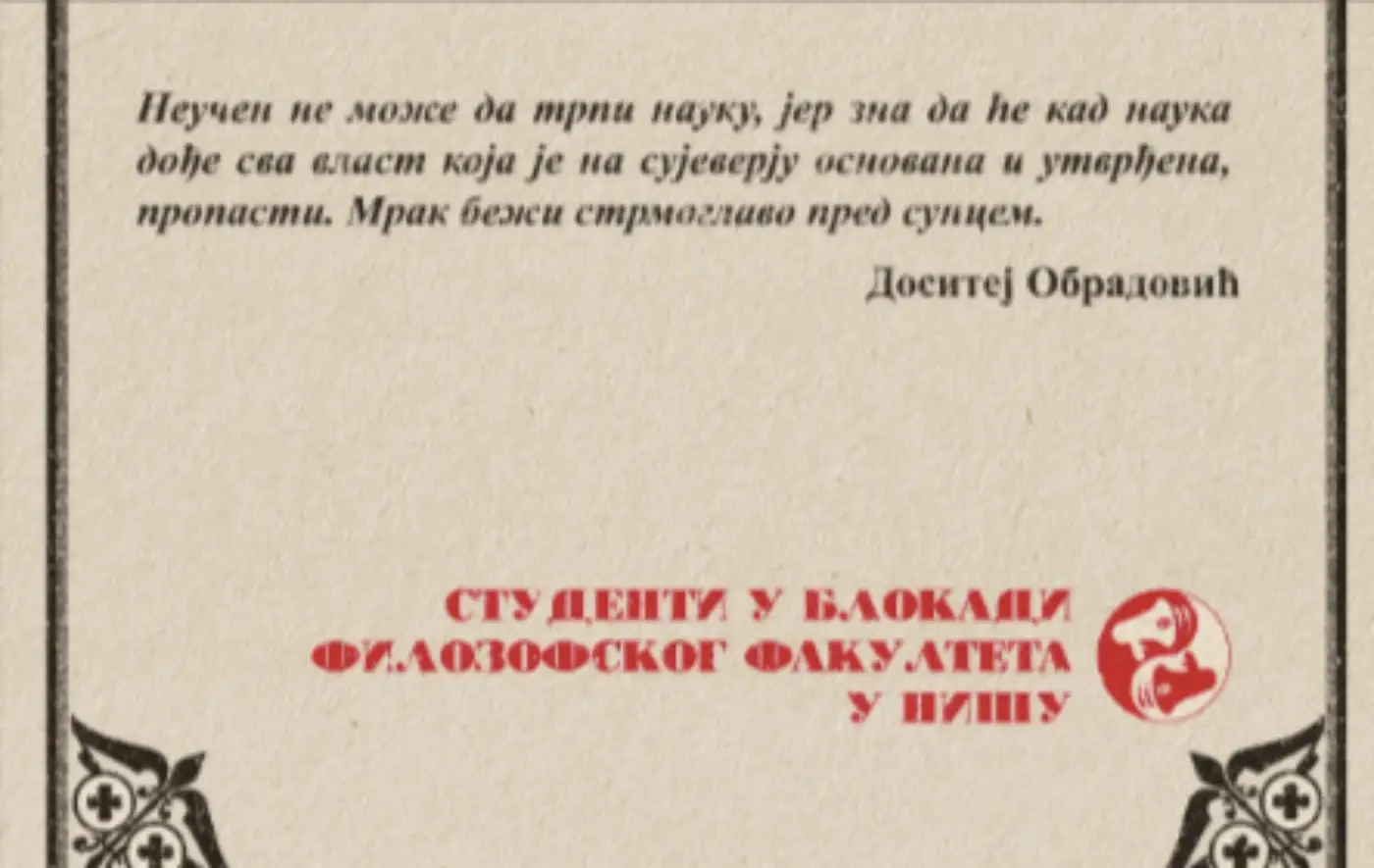 Svoje saopštenje, studenti u blokadi zaključuju rečima prosvetitelja Dositeja Obradovića: „Neučen ne može da trpi nauku, jer zna da će, kad nauka dođe, sva vlast koja je na sujeverju osnovana i utvrđena, propasti. Mrak beži strmoglavo pred suncem“.