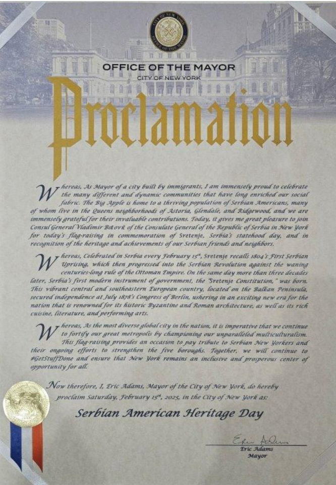 Grad Njujork i gradonačelnik Erik Adams proglasili su 15. februar Dan državnosti Republike Srbije – Sretenje – Danom srpsko-američkog nasleđa u Njujorku.