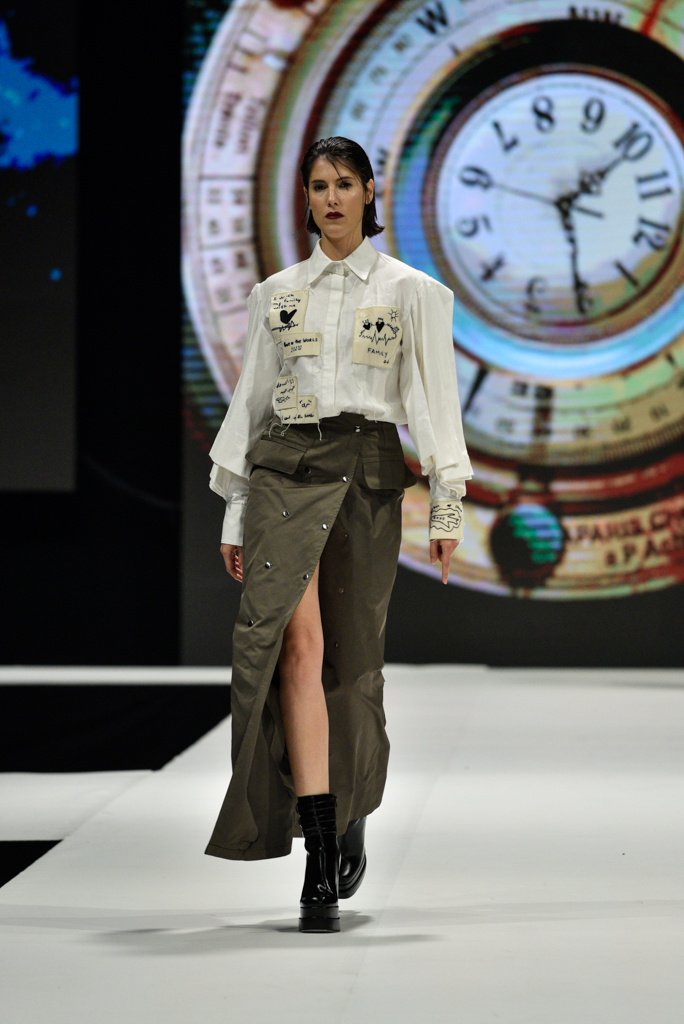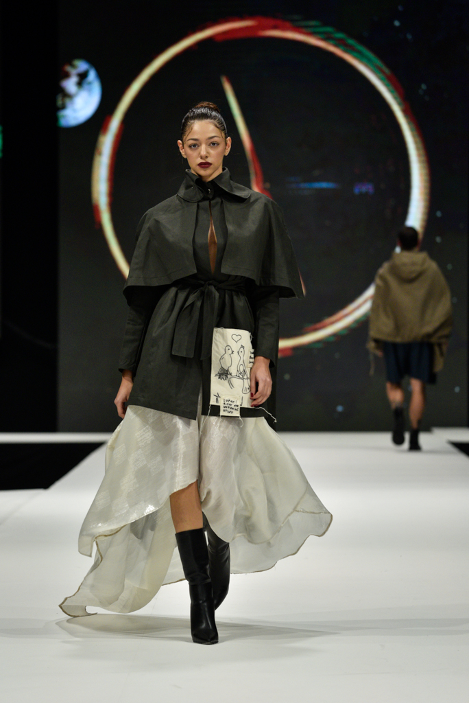 Kolekcija viđenu sinoć u Hangaru, odražava fuziju kultura, ističući veštine, težnje i snagu ljudi u pokretu, poručujući kroz njihove kreacije i inovacije da su migranti pre svega ljudska bića. Zato je padobran poslužio kao glavna inspiracija i simbol otpornosti koji objedinjuje lakoću i punoću života u pokretu. Kao što padobran nosi u nepoznato, svaka silueta u kolekciji odražava ovu vizuelnu lakoću, noseći poruke nade i snova.