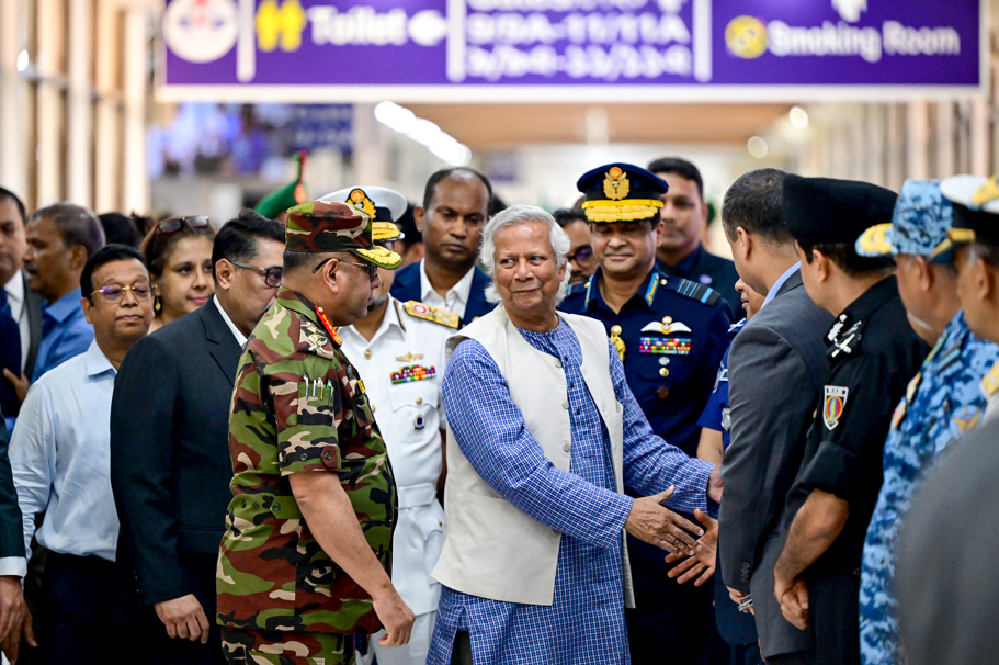 Obezbeđenje na aerodromu je bilo pojačano kako bi se osigurao Junusov dolazak pošto u zemlji još tinjaju neredi nakon pada Hasine u ponedeljak.