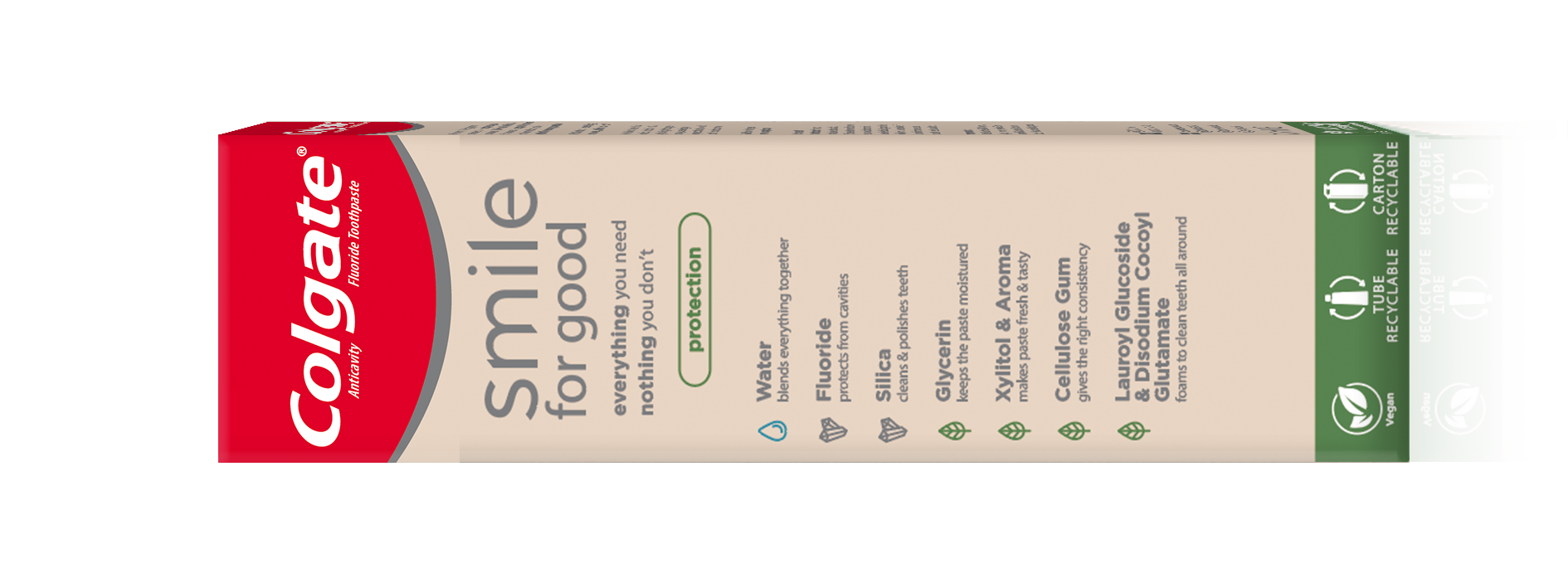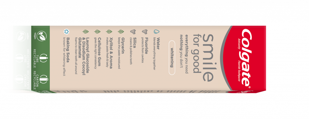 Colgate je lansirao novu pastu za zube Smile for Good čiji sastojci su jasno navedeni na prednjoj strani pakovanja uz objašnjenje svrhe svakog pojedinačnog sastojka. Smile for Good je prva Colgate pasta koja je upakovana u tubu koja može da se reciklira.