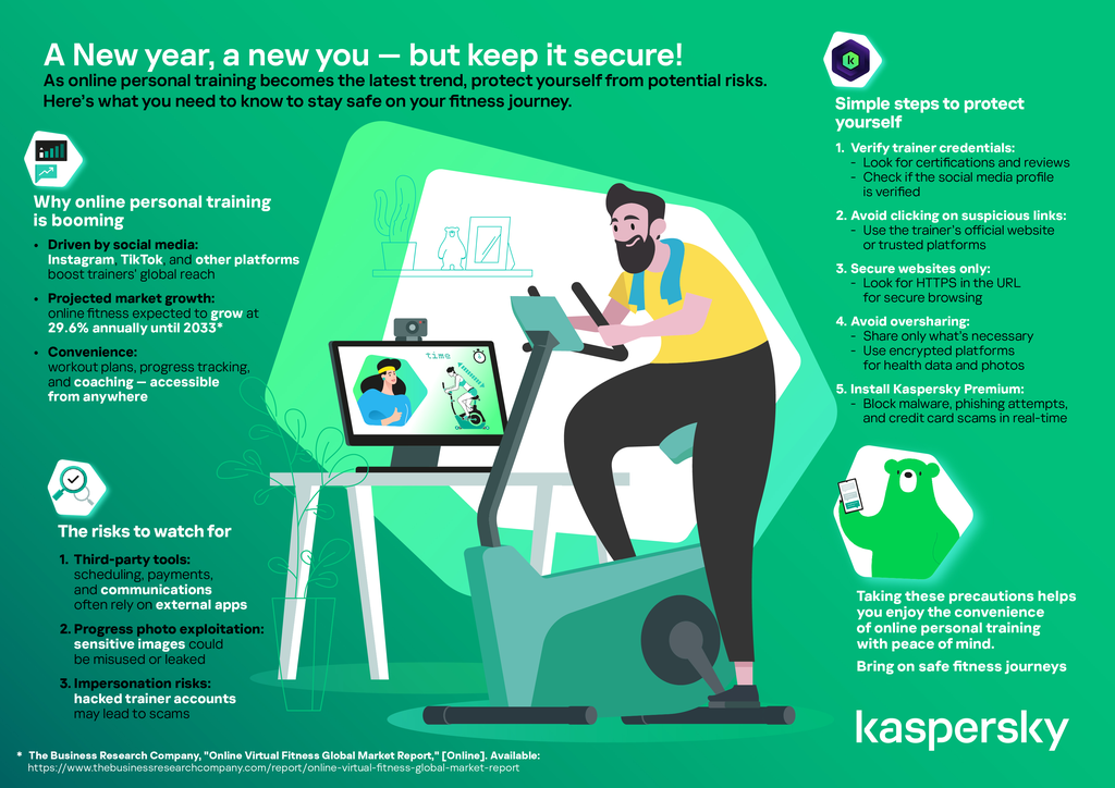Zdravstveni i fitnes ciljevi su dosledno na vrhu liste „novogodišnjih rezolucija“ širom sveta, što potvrđuju i godišnji izveštaji. U skladu sa tim trendom, pojavila se prava pomama za onlajn personalnim treninzima, podstaknuta uticajem društvenih mreža poput Instagrama i TikToka. Dok ljudi započinju svoje fitnes i detoks avanture ove nove godine, mnogi se okreću ovim uslugama ne shvatajući u potpunosti potencijalne rizike po bezbednost njih samih i njihovih podataka. Kako bi korisnicima pomogli da bezbedno prebrode ove izazove, kompanija Kaspersky daje smernice o tome kako da izbegnu ove rizike i koje mere da preduzmu kako bi to iskustvo bilo bez bezbednosnih propusta.