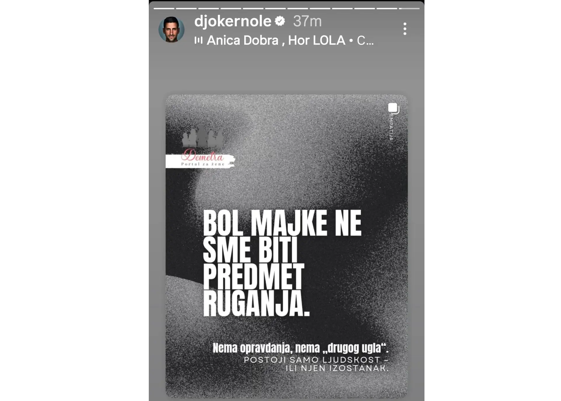 „Bol majke ne sme biti predmet ruganja. Nema opravdanja, nema ‘drugog ugla’. Postoji samo ljudskost ili njen izostanak“, objavio je Đoković na Instagram storiju.