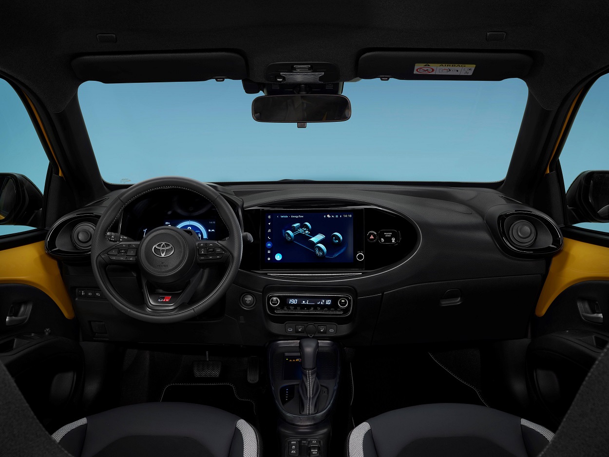 Već smela prednja maska modela Aygo X dobija i prepoznatljivu, ekskluzivnu mrežastu površinu stilizovanu „G-formom“ koja se može videti i na drugim modelima GR porodice, kao i jedinstvene GR SPORT aluminijumske naplatke. Unutar kabine, crni i sivi detalji, uz vezeni GR logotip, upotpunjuju sportski duh.