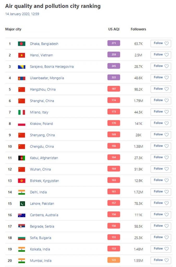 Beograd se danas, prema merenjima portala AirVisual, našao na 17. mestu u svetu po zagađenju vazduha.