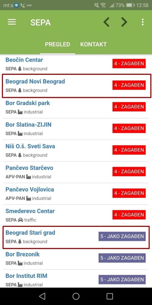 Agencija za zaštitu životne sredine objavljuje na aplikaciji „Kvalitet vazduha u Republici Srbiji“ da su pojedini delovi grada, poput Novog Beograda i Starog grada zagađeni, odnosno jako zagađeni.