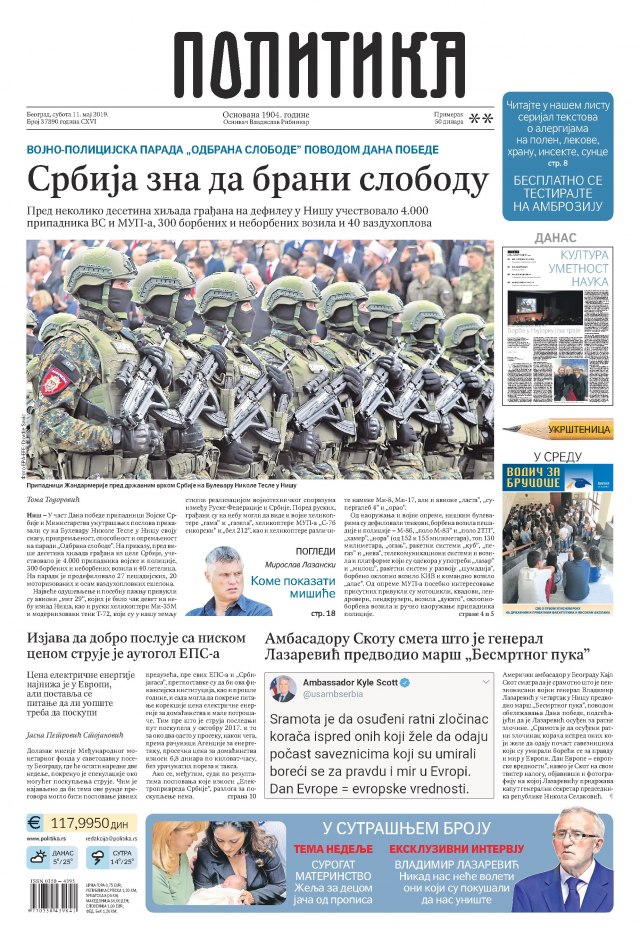 „Naša teška rana danas je Kosovo. Sveta srpska zemlja koje se ne smemo odreći, jer će nas stići kletva Svetog cara Lazara i ostalih kosovsko-metohijskih mučenika. Prokleće nas istorija i muke svih postradalih na Kosovu. To ne smemo po cenu života“, rekao je patrijarh Irinej na proslavi slave hrama Svetog Save u Kraljevu.