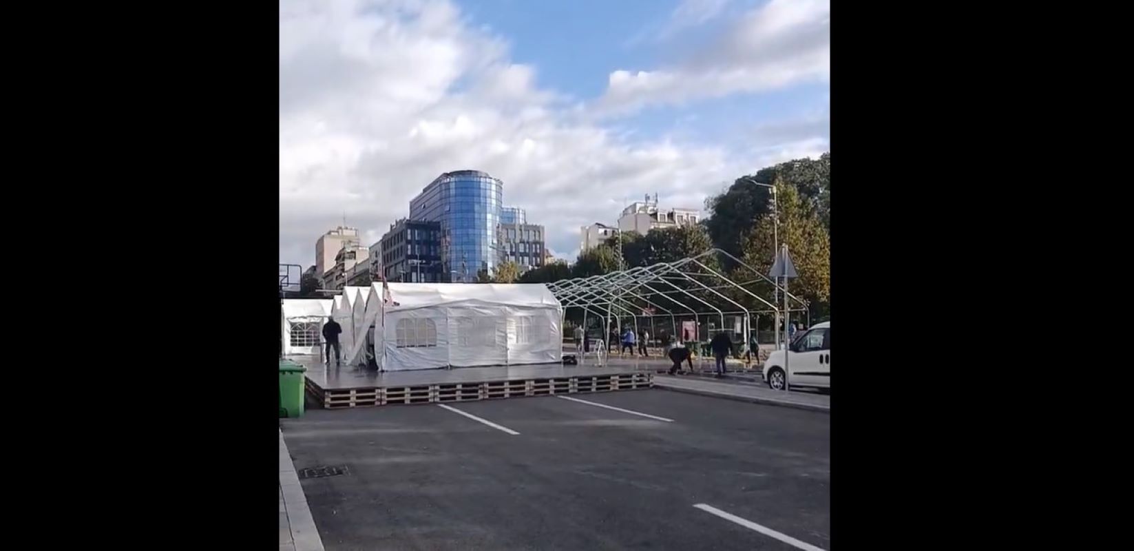 Pored šatora trenutno je parkirano nekoliko kombija, a nekoliko osoba radi na postavljanju novih.
