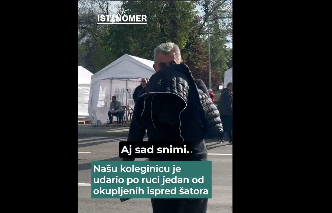 Novinarka Istinomera napadnuta je tokom obilaska belih šatora koji se nalaze preko puta Skupštine Srbije, iako je nosila akreditaciju i predstavila se kao novinarka.