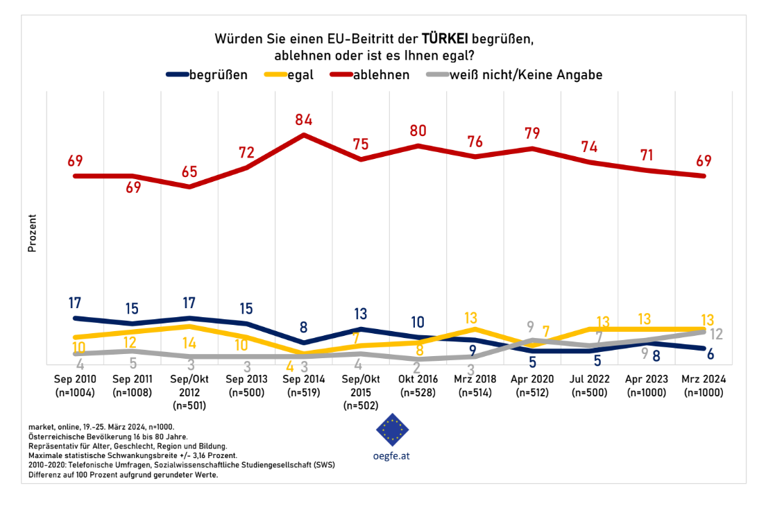 Na dnu lestvice je Turska, čije je pristupanje pozdravilo 6 odsto ispitanika u Austriji, što je smanjenje od 2 posto. Njih 69 odsto bilo je protiv članstva zemlje u EU, u poređenju sa 71 odsto prošle godine, 13 odsto nije zanimalo ovo pitanje, dok 12 odsto nije komentarisalo. Najveći nivo odobrenja za pristupanje Turske EU bio je 2015. godine (13 odsto), najveći nivo odbijanja bio je 2014. godine sa 84 odsto.