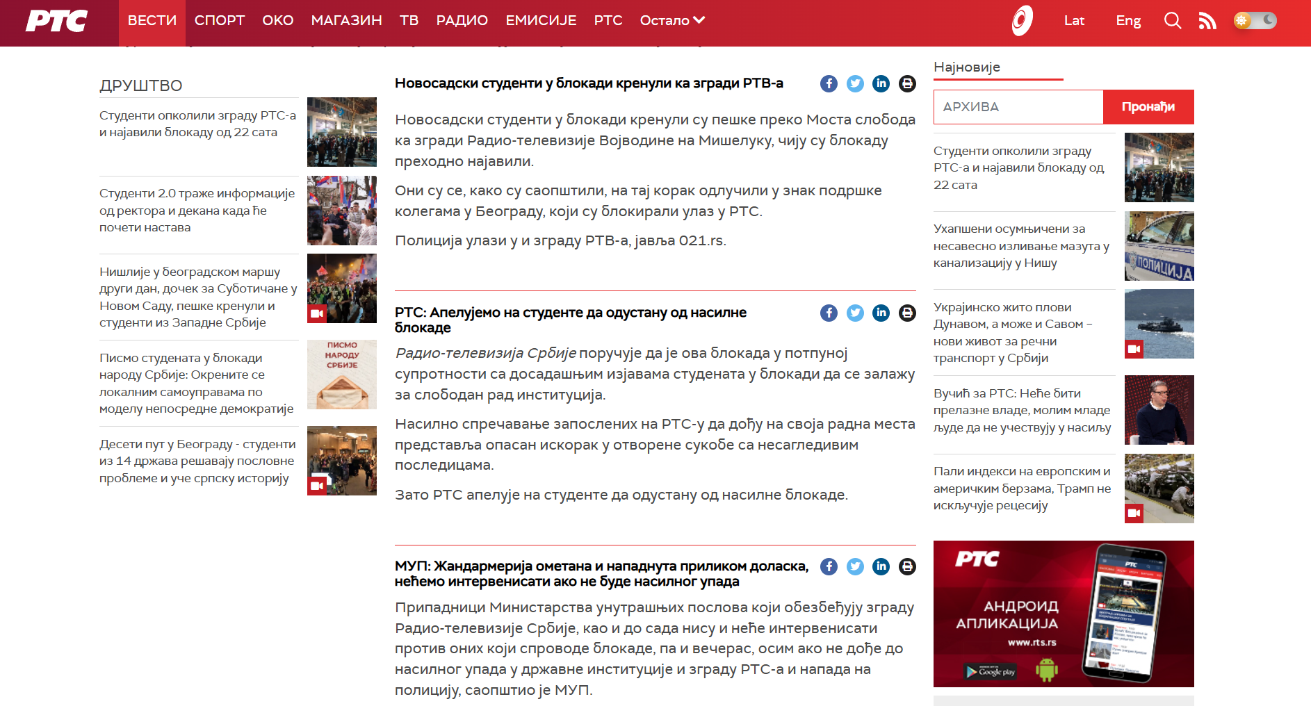 Zato RTS apeluje na studente da odustanu od nasilne blokade“, navodi se u objavi na sajtu.