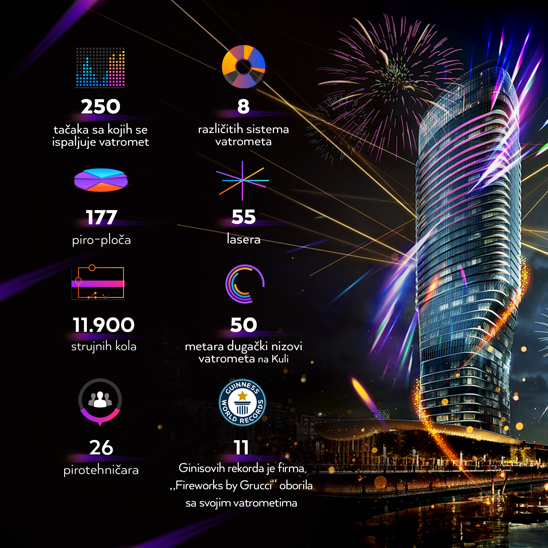 Za veličanstveni vatromet, kakav do sad nikad nije viđen kod nas, koristi se čak 177 piro-ploča i neverovatnih 11.900 strujnih kola. Svetleće komete će se ispaljivati iz 50 metara dugačkih nizova montiranih na fasadi Kule Beograd, a vatromet će biti pušten i sa novobeogradske obale, pa će njegov odraz u Savi dopuniti čaroliju koja će se ove noći dešavati nad Beogradom. Naša prestonica će u 2022. godinu ući osvetljena kao najveće svetske metropole poput Njujorka, Dubaija ili Sidneja, pa je ovo događaj koji obavezno treba videti uživo.