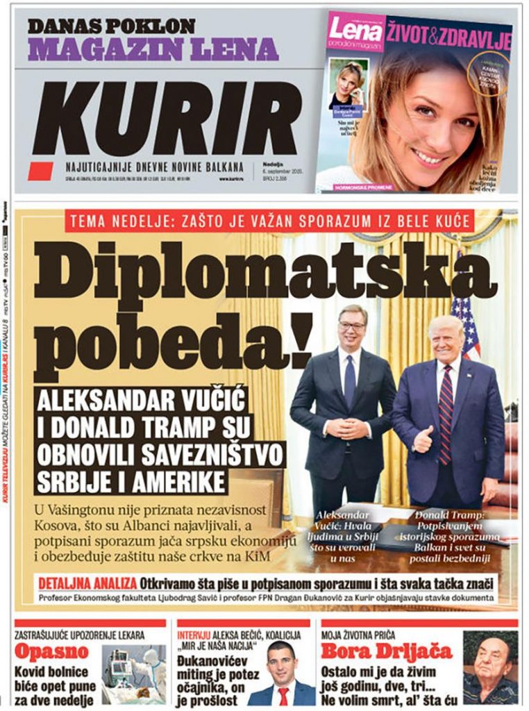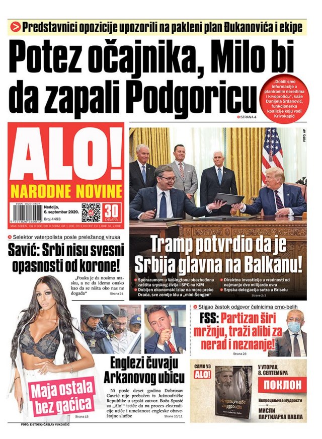 ALO – List tvrdi da ima informacije o planovima za nerede u Crnoj Gori „Potez očajnika, Milo bi da zapali Podgoricu“. O detaljima sporazuma iz Bele kuće „Tramp potvrdio da je Srbija glavna na Balkanu“.(Beta)