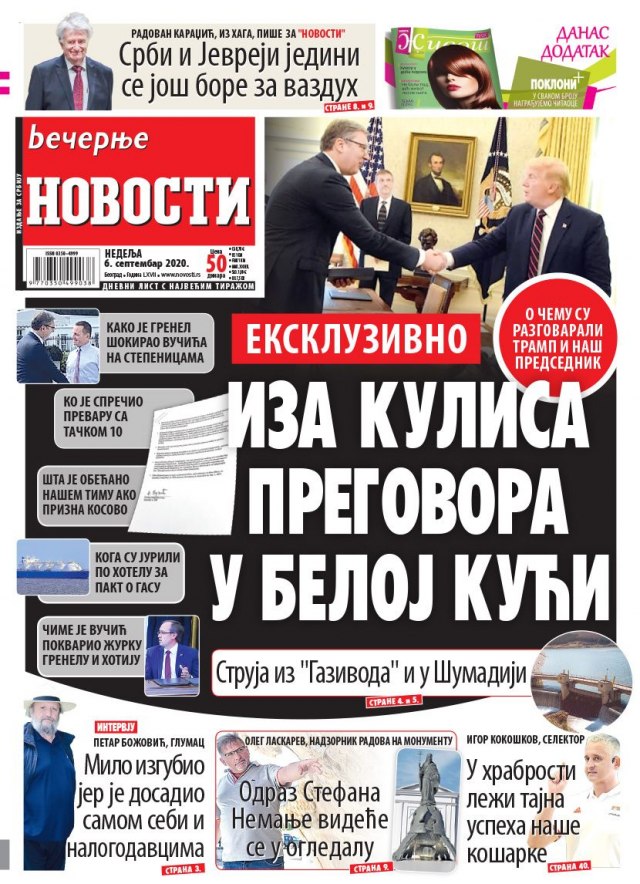 VEČERNJE NOVOSTI – Pod naslovom „Iza kulisa pregovora u Beloj kući“, list piše o potpisivanju sporazuma u Vašingtonu. Izjava nadzornika radova skulpture Stefana Nemanje u Beogradu „Odraz Stefana Nemanje videće se u ogledalu“.