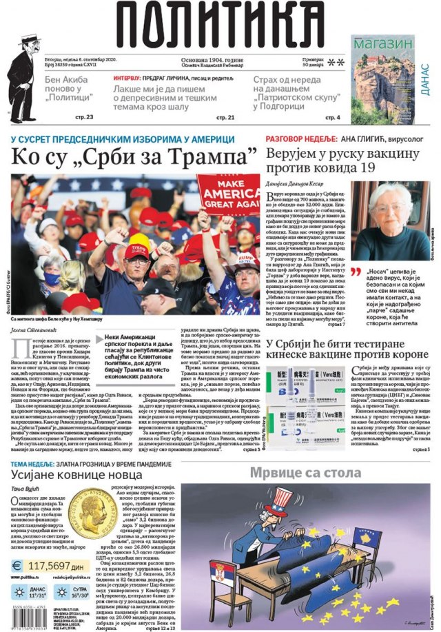 POLITIKA – Intervju sa virusologom Anom Gligić „Verujem u rusku vakcinu protiv kovida 19“. O predsedničkim izborima u SAD pod naslovom „Ko su ‘Srbi za Trampa'“.