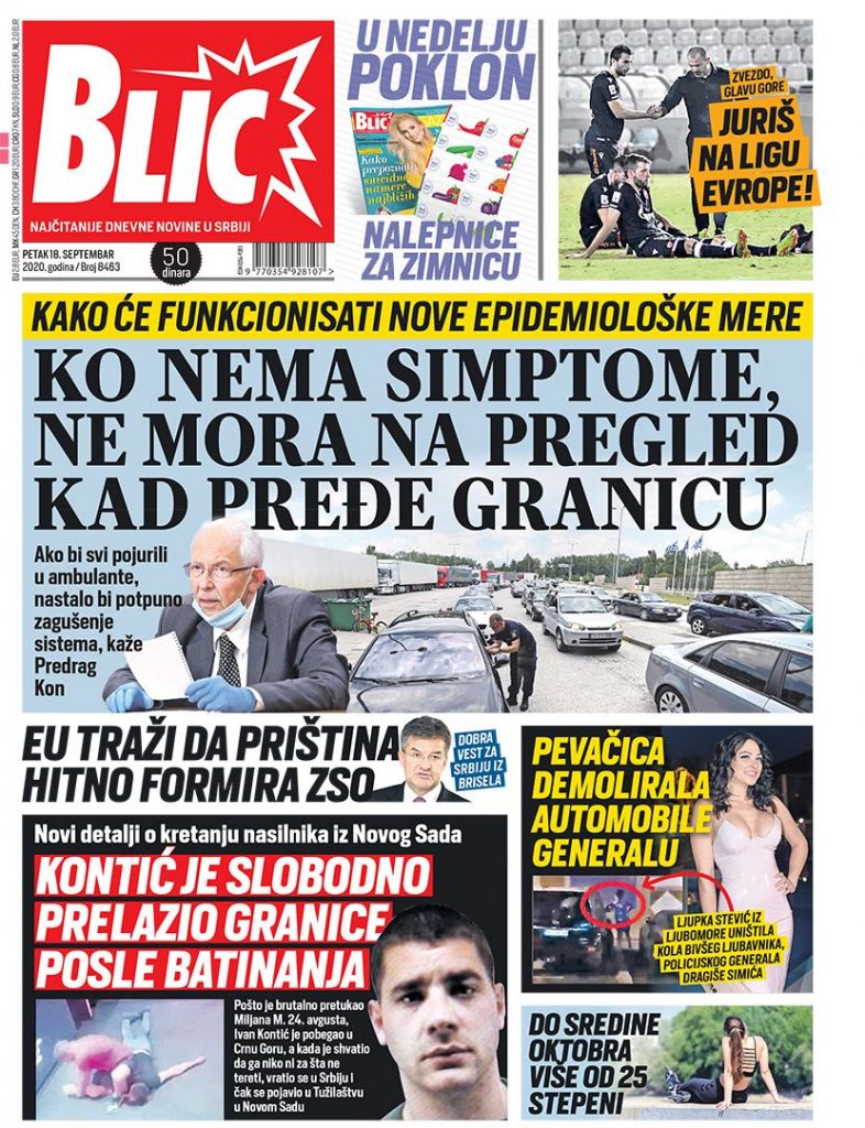 BLIC – Kako će funkcionisati nove epidemiološke mere „Ko nema simptome ne mora na pregled kad predje granicu“. Dobre vesti za Srbiju iz Brisela „EU traži da Priština hitno formira Zajednicu srpskih opština“. Novi detalji o kretanju nasilnika iz Novog Sada „Kontić je slobono prelazio granice posle batinanja“.