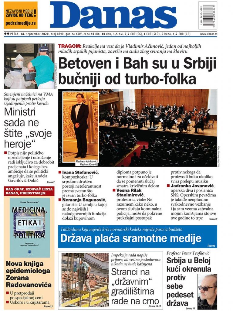 DANAS – Smenjeni načelnici na VMA koji su potpisali peticiju Ujedinjeni protiv kovida u tekstu „Ministri sada ne štite svoje heroje“. Profesor prava Petar Teofilović „Srbija u Beloj kući okrenula protiv sebe pedeset država“. Reakcije na vest da je jedan od najboljih srpskih pijanista završio na sudu zbog sviranja klavira „Betoven i Bah su u Srbiji bučniji od turbo folka“.