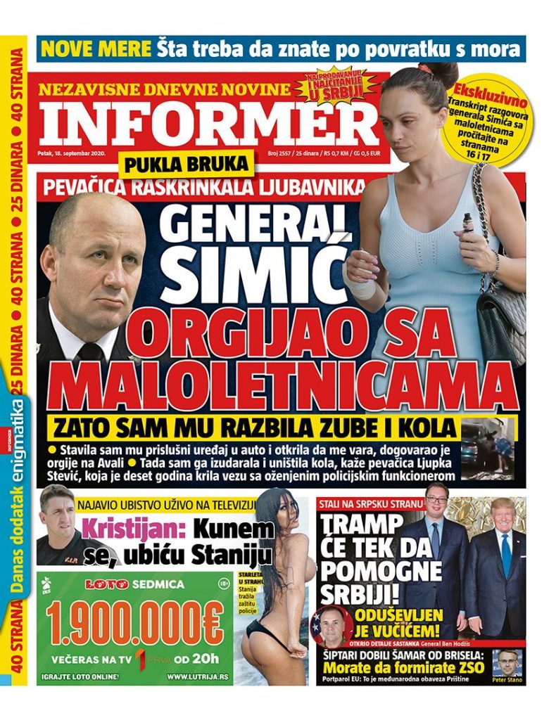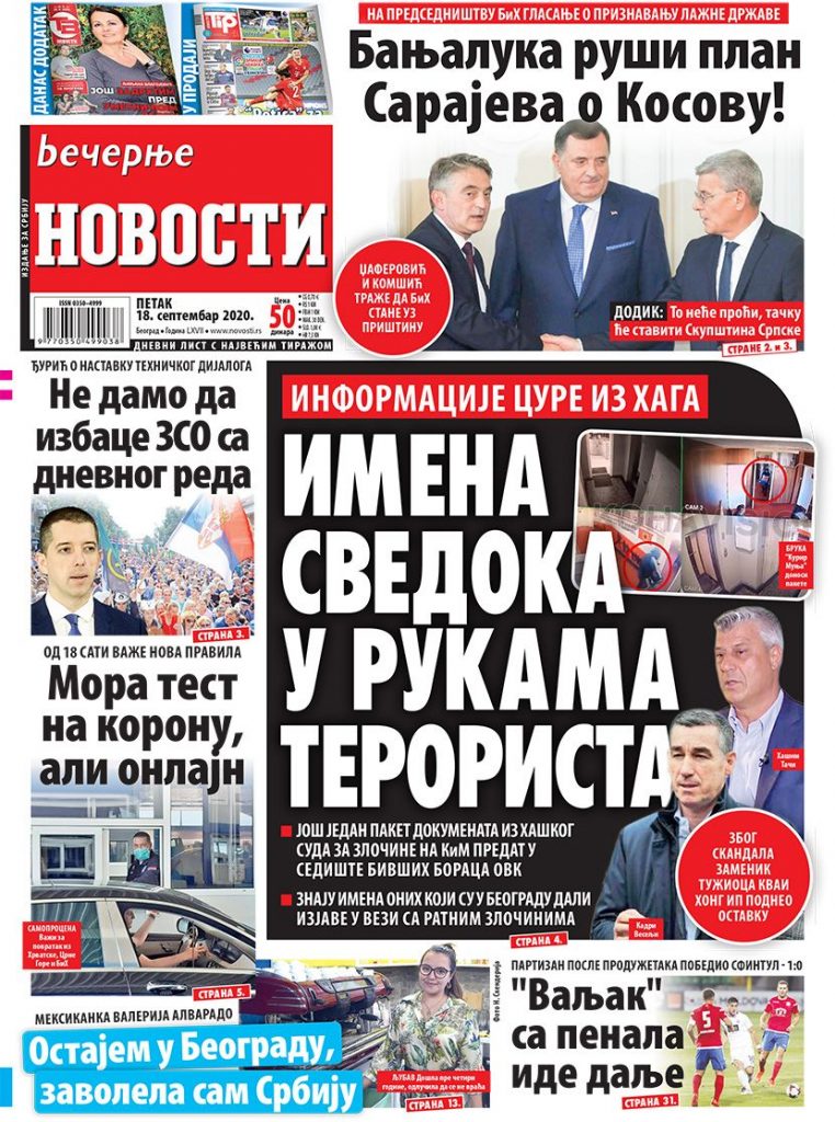 VEČERNJE NOVOSTI – Još jedan paket dokumenata iz Haškog suda za zločine na Kosovu i Metohiji predat u sedište bivših boraca OVK, „Imena svedoka u rukama terorista“. Marko Đurić o nastavku tehničkog dijaloga „Ne damo da izbace ZSO sa dnevnog reda“. Od 18 sati važe nova pravila „Mora test na koronu, ali onlajn“.