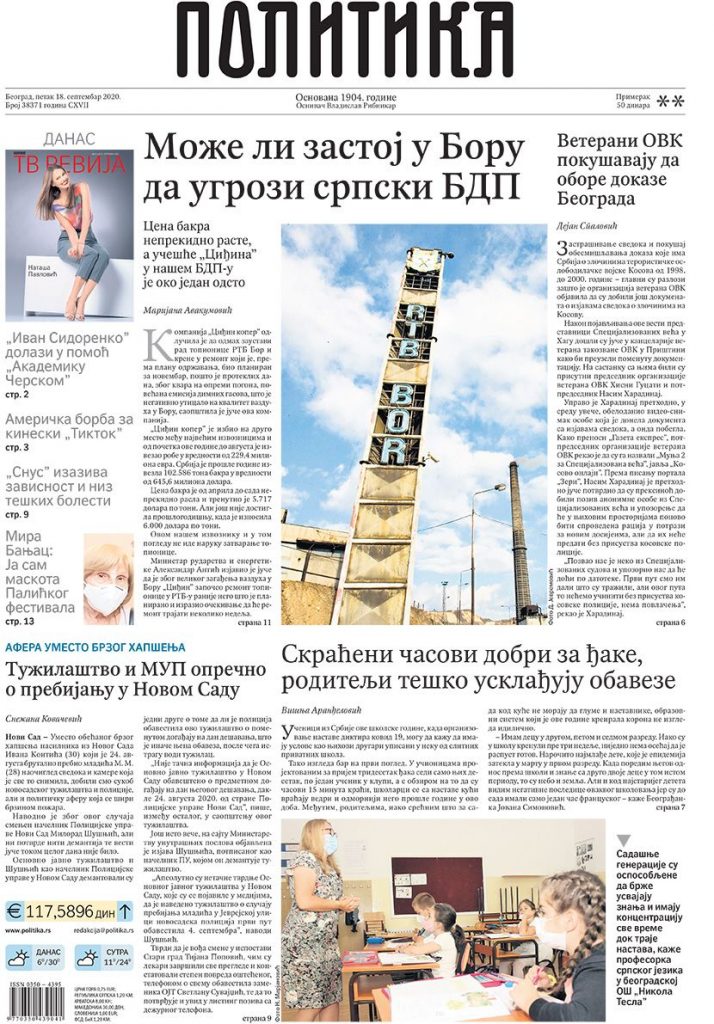 POLITIKA – O ceni bakra koja neprekidno raste „Može li zastoj u Boru da ugrozi srpski BDP“. Afera umesto brzog hapšenja „Tužilaštvo i MUP oprečno o prebijanju u Novom Sadu“.