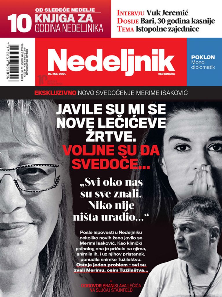 MERIMA – Sve su mi ispričale kako im je Branislav Lečić prilazio na razne nedostojne načine. Sve su u to vreme bile studentkinje. Te devojke se međusobno ne poznaju, ali njihove priče imaju mnogo sličnosti u opisu njegovog nasilnog i manipulativnog ponašanja, ispričala je Merima Isaković u emotivnom intervjuu za Nedeljnik, skoro dva meseca nakon što je prvi put ispričala o zlostavljanju koje je pretrpela od Branislava Lečića, a što nije bilo dovoljno da se proces protiv njega pomeri sa mrtve tačke.