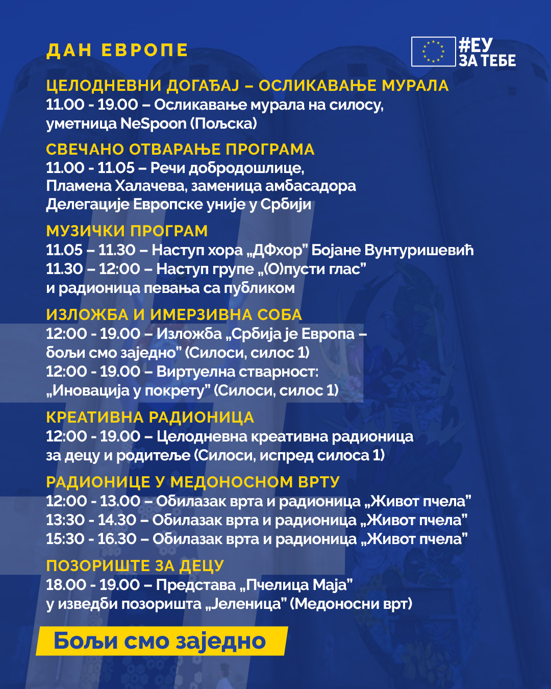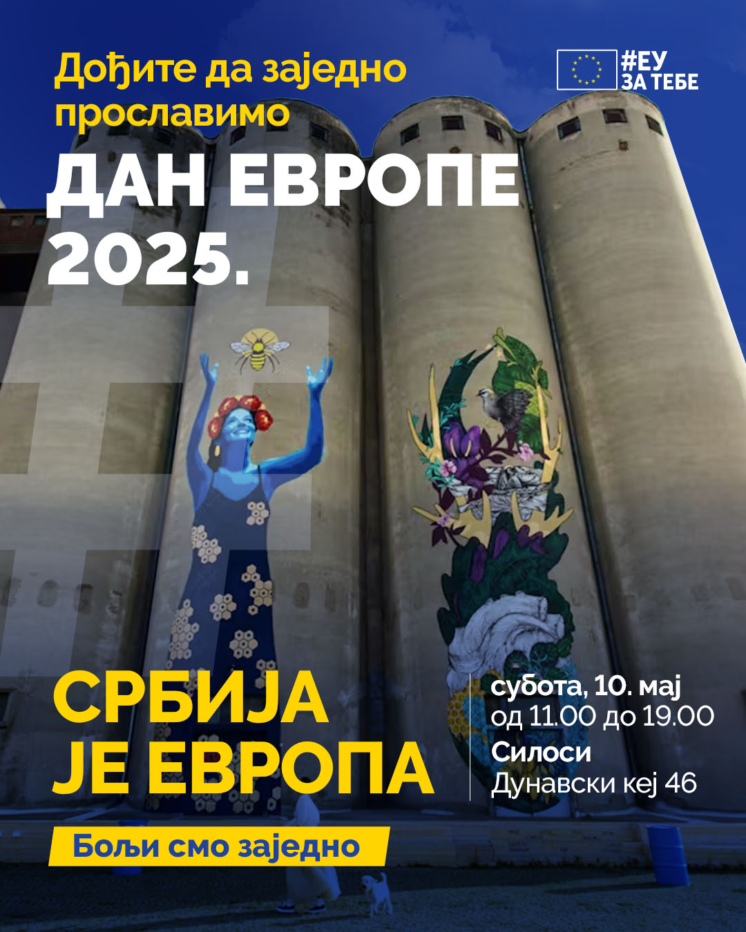 Povodom obeležavanja Dana Evrope Delegacija Evropske unije u Srbiji organizuje događaj koji je otvoren za javnost u subotu, 10. maja od 11.00 u Silosima, Dunavski kej 46, Beograd.