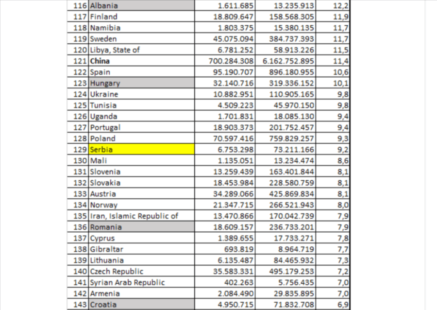 Dobra vest je da se Srbija našla pri dnu rang liste, na 129. mestu među ukupno 153 zemalja i teritorija, s obzirom na to da najveću robnu razmenu ostvarujemo sa EU i državama regiona.