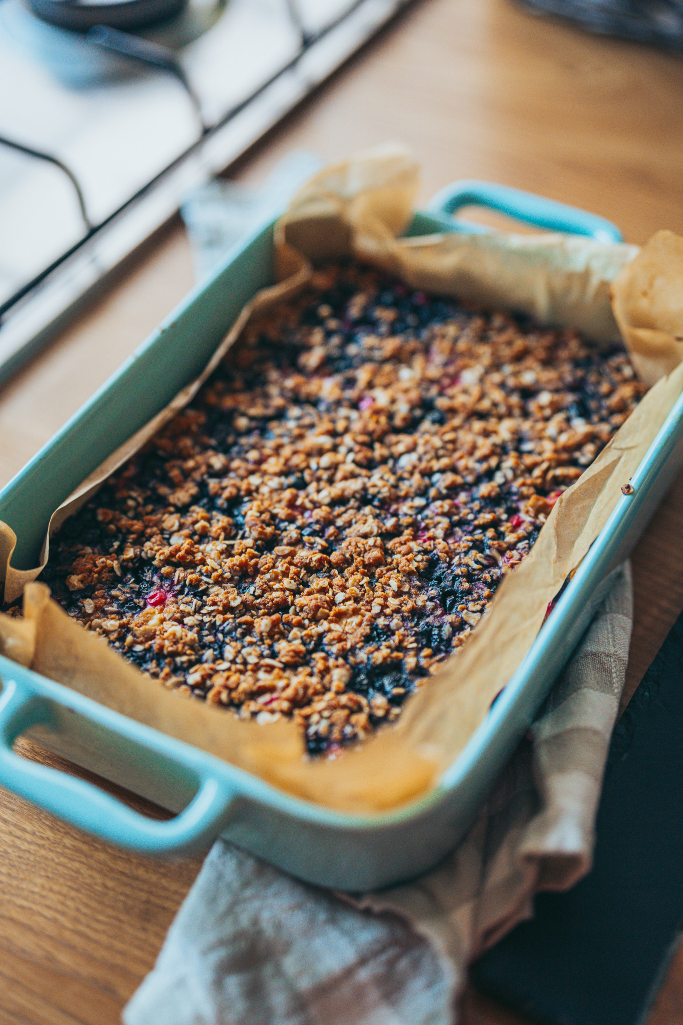 - Ostatak smese za koru (1/3) posuti preko voća blago pritiskajući