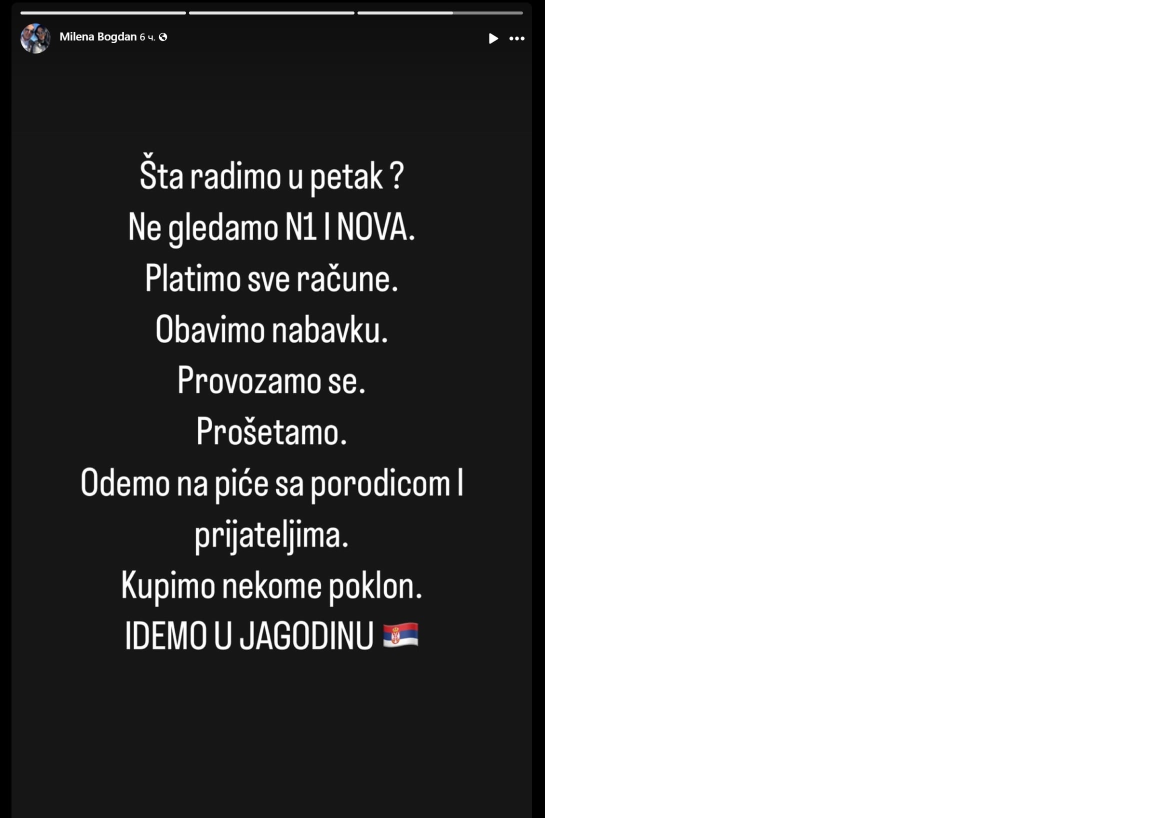 Poruku je takođe stavila i Milena Popović, nevenčana supruga Olivera Ivanovića i državna sekretarka u Ministarstvu turizma i omladine, ali kako prenosi N1 ona je ubrzo tu objavu skinula sa svog profila na X. Ali na njenom Instagramu i Facebook profilu je ostala ta objava, koja se razlikuje od Terzićeve.