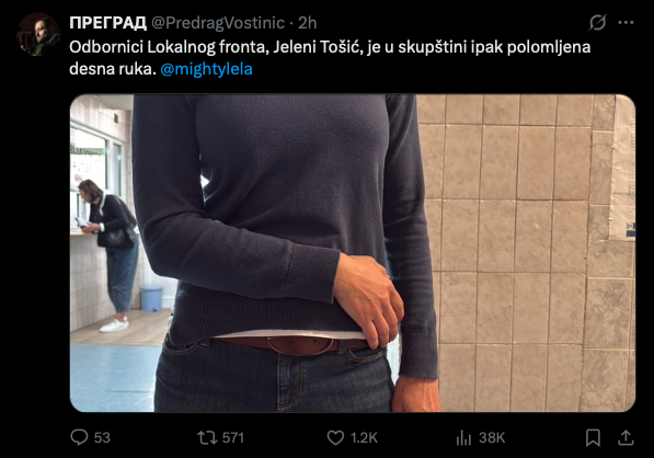 „Odbornici Lokalnog fronta, Jeleni Tošić, je u skupštini ipak polomljena desna ruka“, napisao je Voštinić i postavio sliku odbornice Tošić kako drži savijenu desnu ruku.