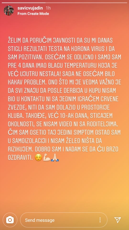 „Osećam se odlično i samo sam pre četiri dana imao blagu temperaturu, koja je već ujutru nestala. Sada ne osećam bilo kakav problem“, napisao je Vujadin Savić na Instagramu.