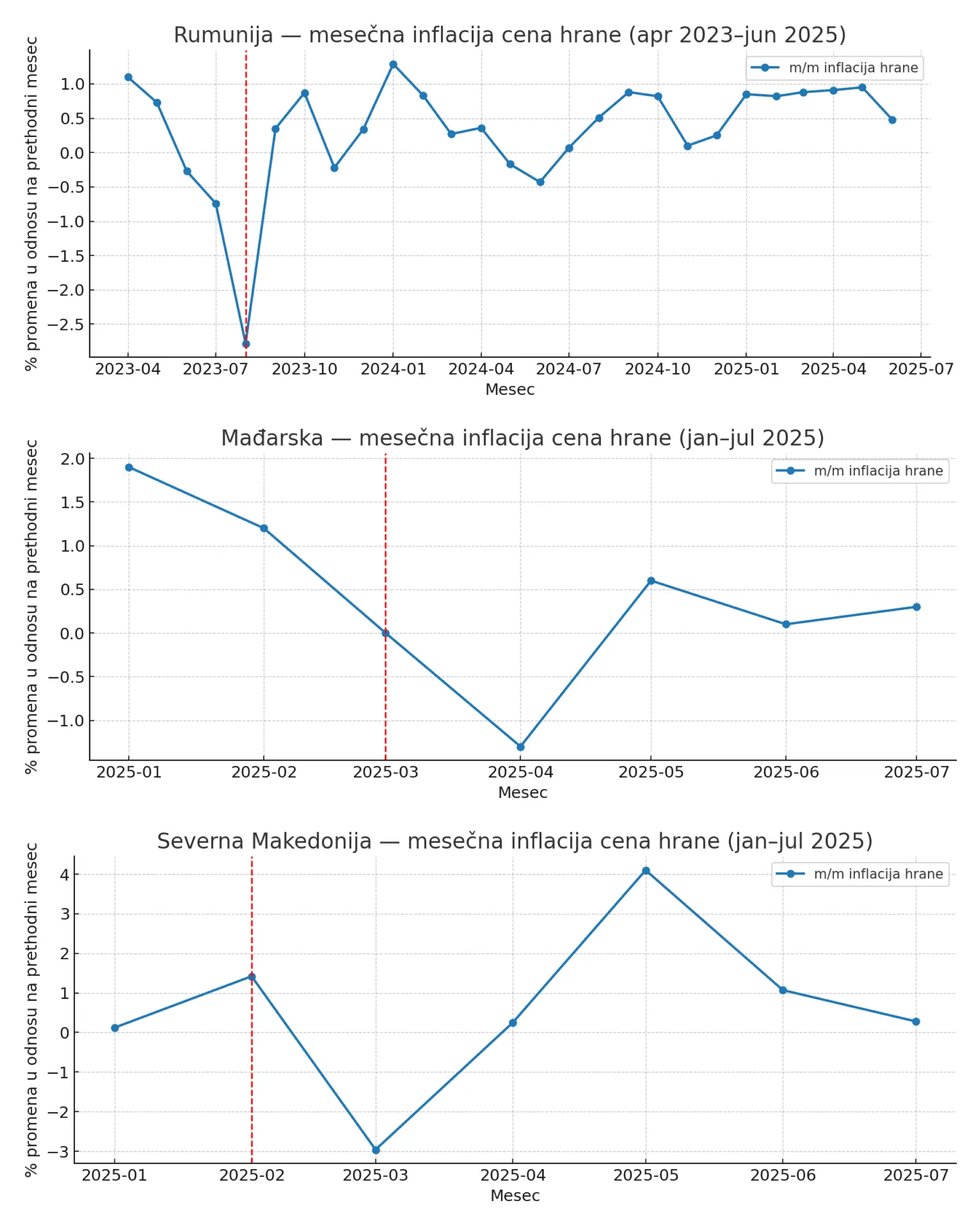 „Ako posmatramo slučajeve Rumunije, Mađarske i Severne Makedonije, koje je upravo i Vučić naveo tokom intervjua, može se primetiti sličan obrazac. U mesecu uvođenja mere ili jedan mesec kasnije dolazi do smanjenja cena hrane za, u slučajevima tih zemalja, maksimalnih 3 posto, nakon čega u narednim mesecima dolazi do povratka cena hrane na početni nivo“, ističe Kelić, koji je i odbornik opozicionog Zeleno-levog fronta.