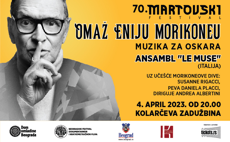 Dom omladine Beograda predstavlja jedinstven muzički događaj za nezaboravnu završnicu jubilarnog 70. Martovskog festivala! Muziku Enija Morikonea iz nagrađivanih filmova izvodi orkestar Le Muse (Italija), uz učešće Morikoneove dive, muze i inspiracije Suzane Rigači, peva Daniela Plači, a diriguje Andrea Albertini.