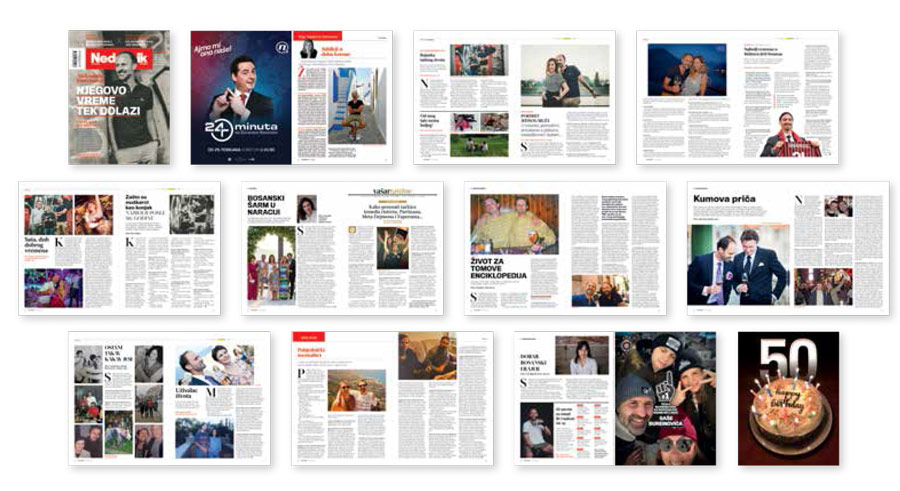 Nije to samo u pitanju naslovna strana, na kojoj je njen suprug Aleksandar, sa kao „fejk“ temama i istraživanjem „Zašto su muškarci kao konjak – najbolji posle 50. godine“ ili tipičnim „Srećan rođendan, tata“, već pravi Nedeljnik, sa tekstovima unutra, kolumnama, glosama, podnaslovima i nadnaslovima, slikama iz privatne arhive, esejom i reklamama! Sve personalizovano za 50. rođendan Aleksandra.