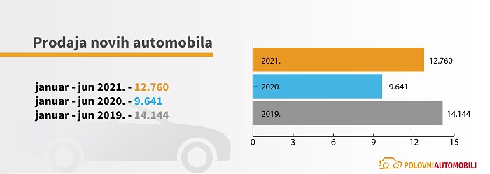 Primetan je i oporavak tržišta novih automobila, nakon drastičnog pada prodaje od 21% u 2020. godini. Tako je prva polovina ove godine ipak donela rast prodaje novih vozila od 32% u odnosu na isti period prošle godine obeležen pandemijom virusa COVID-19. Ipak, prodaja novih automobila u tekućoj godini još uvek nije dostigla njihovu prodaju u periodu pre pandemije, već je za skoro 10% manja.