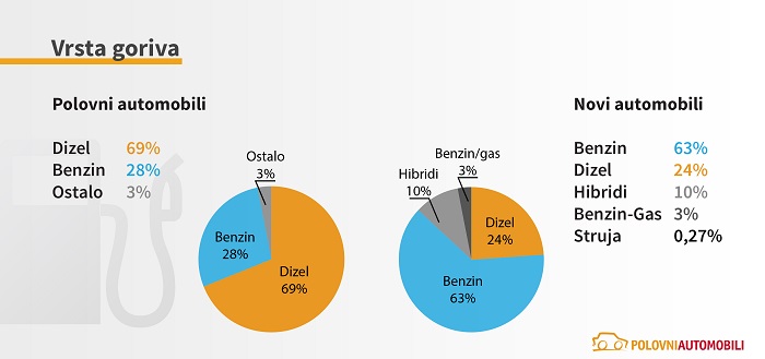 Zanimljivo je da je različit izbor kupaca novih i polovnih automobila primetan i u pogledu vrste goriva. Dizel motor je ubedljivo najpopularniji za kupce polovnjaka, za njega se odlučilo 69%, dok je benzin izabralo 28%.