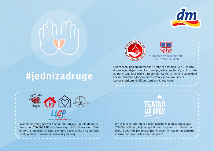 Poklone povodom Osmog marta kompanija je usmerila i humanim damama koje godinama dobrovoljno daju krv u okviru akcije „Ništa bez žena“, pri Institutu za transfuziju krvi Srbije u Beogradu. Uz to, dm je namenio poklone i svim ženama i njihovim partnerima koji na ovaj praznik doniraju krv pri Univerzitetskom kliničkom centru u Kragujevcu.