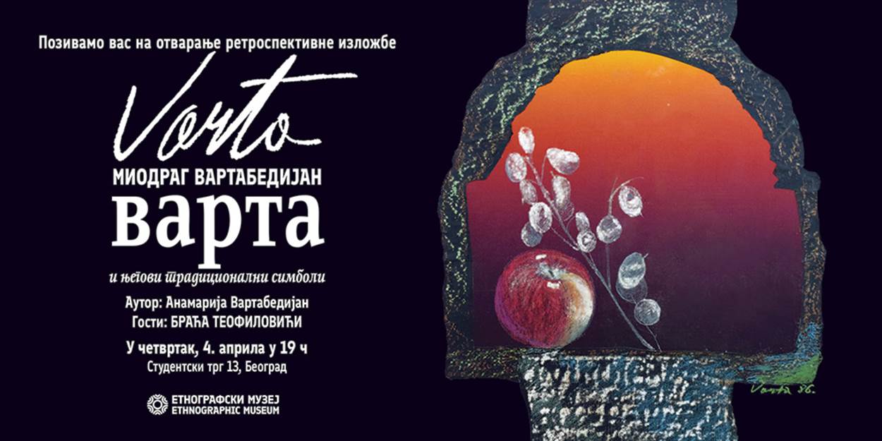 Etnografski muzej vas sa velikim zadovoljstvom poziva na otvaranje retrospektivne tematske izložbe jedinstvenog umetničkog izraza „Miodrag Vartabedijan Varta i njegovi tradicionalni simboli“, autorke Anamarije Vartabedijan, u četvrtak 4. aprila u 19 časova.