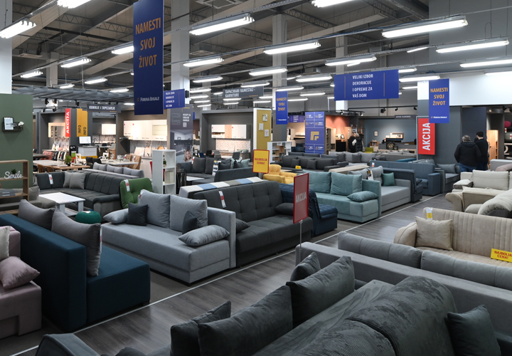 U novom salonu Forma Ideale kupcima je predstavljen deo asortimana pločastog i tapaciranog nameštaja Forma Ideale, deo asortimana partnerskog programa, veliki izbor laminata, tepiha, rasvete, dekoracije, kao i bogata ponuda malih kućnih aparata.