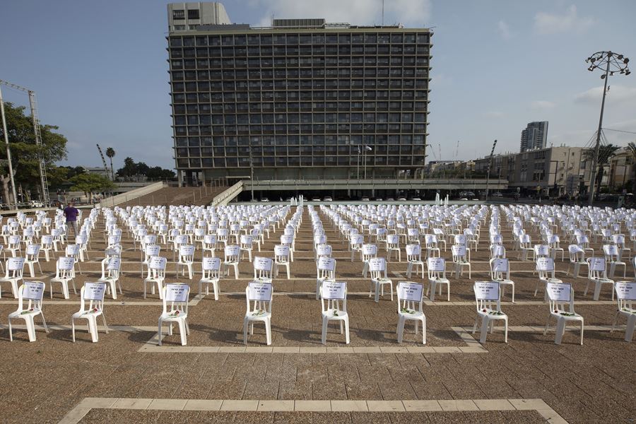 Na Trgu Rabin u Tel Avivu danas je postavljeno 1.019 praznih stolica i na svakoj po jedna ruža u znak protesta zbog politike Vlade Izraela u krizi nastaloj zbog pandemije koronavirusa.