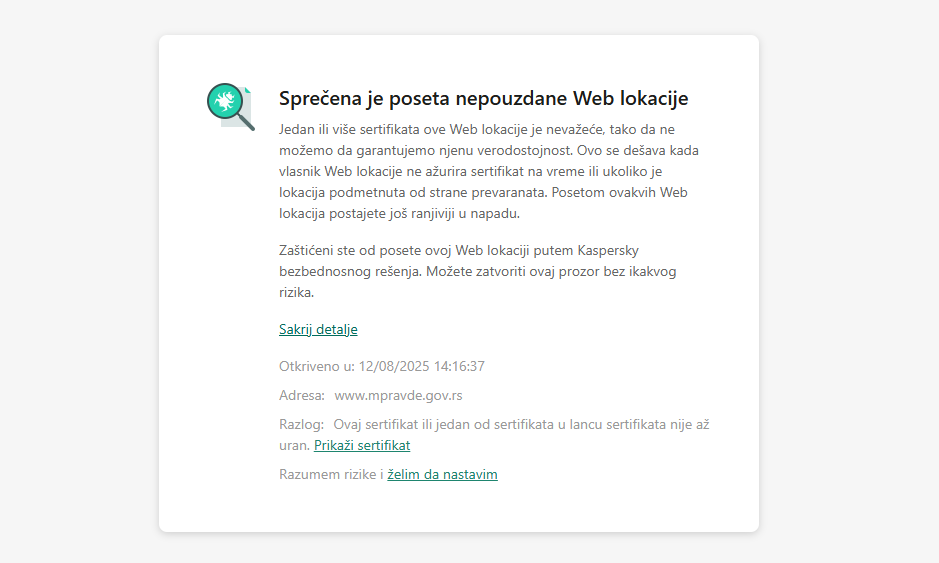 Odgovor smo pokušali da pronađemo na sajtu Ministarstva pravde, kako bismo utvrdili da li je rešen problem hakerskog napada, ali pretraživač nas je upozorio da je „sprečena poseta nepouzdane Web lokacije“.